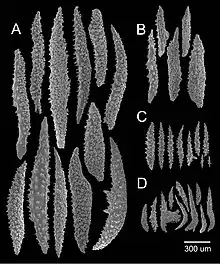 Las escleritas son de diversa forma según su ubicación en la colonia, las de la superficie exterior son tubérculos o husos de 0,1 a 3 mm, según especie, en ocasiones con fuertes espinas en un lado. La capa interna está provista de espículas espinosas, rectas o encorvadas, y tornos. Las de los cálices son husos >3 mm.[4][5] El color de las escleritas puede ser blanco, en varios tonos de amarillo, ámbar, naranja, púrpura o rojo.[3]