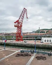 La construcción se hizo a base de perfiles roblonados, uniendo las chapas que forman la estructura mediante tornillos calentados a 900 grados que eran incrustados con un mazo en su correspondiente lugar. La cabina de mandos está situada a 35 metros sobre el suelo y el cuadrilátero a 60 metros. Se movía sobre vías para poder desplazarse por el muelle. El motor principal, de 65 caballos de vapor de potencia, fue realizado por la empresa bilbaína Elorriaga Industria Eléctrica de Zorrozaurre.[7]