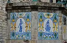 - Jarra de cerámica: Una de las obras más conocidas de Josep Aragay es el conjunto de baldosas que decoran la fuente de Santa Ana, en la avenida del Portal de Àngel de Barcelona (1918). Se trata de una de las obras más apreciadas de la cerámica novecentista. El Museo de Breda conserva una de las jarras originales que Aragay diseñó para coronar la fuente. Esta pieza, inspirada en el antiguo muestrario grecorromano, está esmaltada en verde y manganeso, decorada con frutas y con el relieve de un caballero en la parte frontal.[8]