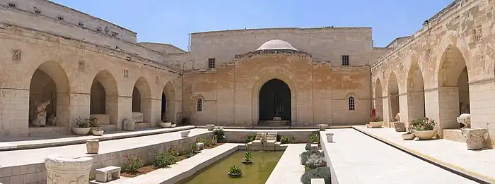 Una pequeña fuente octogonal, cuyas aguas una vez llenado su depósito fluían a través de un estrecho canal hacia la piscina central, se encuentra en el centro del patio. La fuente fue desmantelada durante la ocupación del gobierno jordano.
