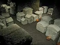 Contenía cincuenta urnas cinerarias del «tipo perugino», en travertino (de las que dos conservan el revestimiento de estuco, y un sarcófago en arenisca, datable entre los siglos III y I a. C., cuyas inscripciones muestran el paso de la lengua etrusca al latín. La tumba ha sido totalmente reconstruida en un local enterrado en el Museo con el corredor dispuesto en la posición original.
