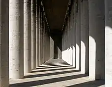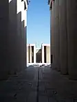 Otra vista de la columnata que precede la entrada al Museo- Copia del Guerrero de Capestrano, ejemplo de arte prerromano; pequeñas reconstrucciones de las viviendas arcaicas de Roma.