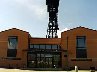 ![]() Fachada principal del Museo de la Minería, con el castillete minero de Pozo Norte. | ||