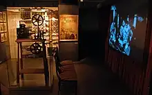 - Proyector de cabina de cine. Reconstrucción, con los aparatos originales, de la cabina de proyección de la sala de cine de Torroella de Fluvià. En este pueblo vivía Tomàs Mallol, artífice de la colección que se muestra en la exposición permanente del Museo del Cine. Es un ejemplo de la típica cabina de proyección de una sala de cine de pueblo. Entre los años 1930 y 1970, las pequeñas salas de cine estuvieron presentes en la mayor parte de los pueblos de nuestro país, donde proyectaban programas dobles de cine que hacían las delicias de grandes y pequeños.[22]