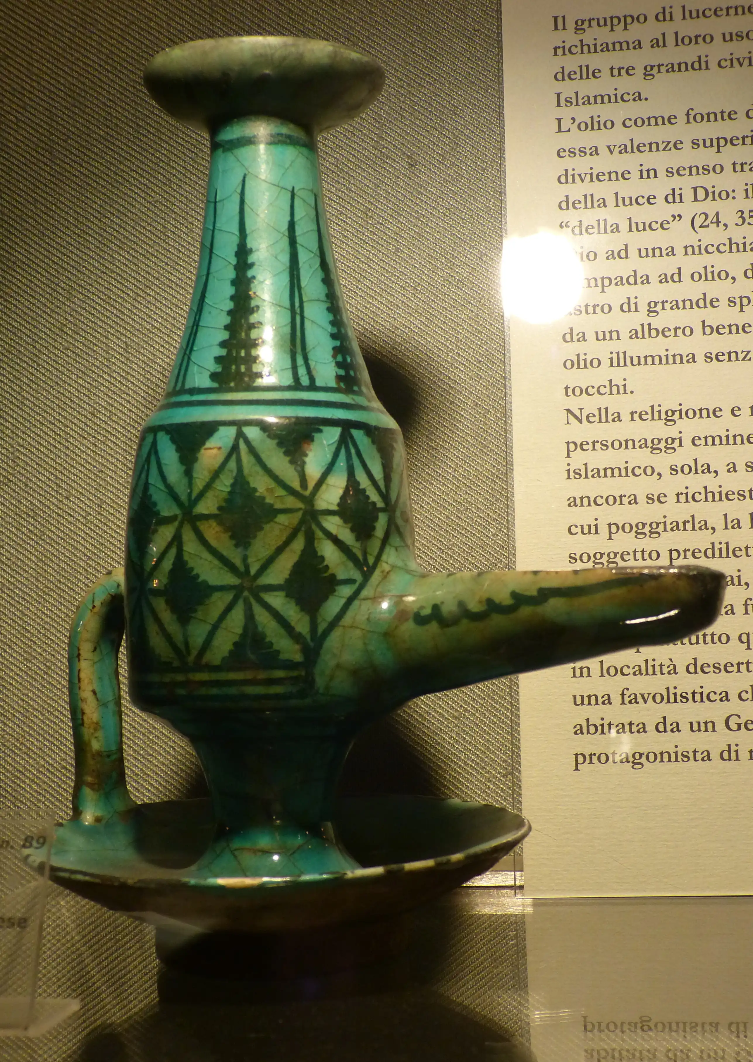 Los entornos sucesivos documentan los usos tradicionales del aceite de oliva: el uso más antiguo –el aceite de oliva como fuente de luz– es documentado por una colección de linternas y lámparas que van desde la Edad preclásica al Neoclasicismo. Los usos rituales del olivo y del aceite de oliva en el Judaísmo, en el Cristianismo y en el Islam, su uso en la alimentación, en el deporte, en la preparación de ungüentos y perfumes, en la sigilografía, en tejido, en ebanistería y en numerosas otras actividades, constituyen las fuentes para las otras salas de la exposición. El complejo de significados simbólicos que, por derivación directa del anterior, confiere al olivo y al aceite de oliva valor sacro, poderes mágicos y terapéuticos, es documentado en la última sala del recorrido expositivo.