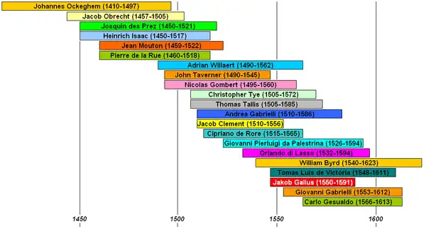 Los dos siglos abarcados por el estilo renacentista suelen ser históricamente divididos en cinco generaciones de compositores.