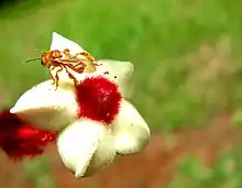 Es un arbusto trepador o un árbol que alcanza un tamaño de 12 m de altura, se encuentra en la selva de las tierras bajas caducifolia; es común de Guinea a Camerún, y extendida en el África tropical, donde se introdujo en la mayoría de los países. Las flores tropicales tienen un color crema, amarillo o naranja con una corola roja.[1]