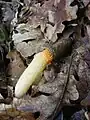 Este pequeño miembro de la familia Phallaceae emerge de un cuerpo fructífero blanco como el huevo que yace medio enterrado en la hojarasca en el suelo del bosque. Los cordones miceliales blancos (rizomorfos) a menudo son visibles debajo de este 'huevo', que mide 2–4 cm de alto y 1–2 cm de ancho.[3] El 'huevo' tiene una piel externa dura (peridio), que cubre una capa interna gelatinosa, que a su vez protege el cuerpo fructífero completamente formado, pero sin expandir. Cuando el "huevo" se abre, el hongo se expande rápidamente (generalmente en unas pocas horas), hasta su altura máxima de 10 a 12 cm. Tiene alrededor de 1 cm de grosor y es de color blanco amarillento, amarillo o naranja claro. El huevo partido se retiene como un saco de tipo volva, en la base. La columna es muy frágil, picada y cilíndrica. Tiene un extremo puntiagudo, y generalmente es curva. La punta está cubierta de materia que contiene esporas (gleba), que es una pasta oscura de color marrón oliva, y tiene un olor que es irresistible para los insectos. (Estos insectos ayudan a distribuir las esporas en sus cuerpos y en sus estómagos). Debajo de la masa de esporas, la punta es de color naranja oscuro. Aunque su olor no es tan fuerte como el del Phallus impudicus, se ha indicado que huele a heces de gato.[4]