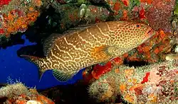 Profundidad corporal de 3.1-3.6 veces y longitud de cabeza de 2.5-2.8 veces la longitud estándar. Fosas nasales posteriores de 3-5 veces más grandes que las frontales. Dientes grandes con caninos bien desarrollados. Preopérculo sin lóbulo sobresaliente en la esquina. El primer arco branquial posee 8 branquias incluyendo 5-6 rudimentarias en la extremidad superior, y en la extremidad inferior posee 15-17 branquias incluyendo 7-9 rudimentarias en la extremidad inferior. La aleta dorsal posee 11 espinas y 15-17 radios blandos, las membranas interespinales indentadas, aleta anal con tres espinas y 11 radios suaves, aleta anal blanda con radios medios alargados en adultos; aleta caudal redondeada en juveniles, truncada en peces de 60-80cm; 17 radios en la aleta pectoral. Escamas ctenoideas en la parte medio lateral del cuerpo en juveniles y lisas en adultos; 82-83 escamas en la línea lateral; 120 escamas laterales. Son de color azul-verdoso hasta marrón con abundantes manchas pequeñas marrones o naranjas; los espacios intermedios forman una red de color verde pálido o blanquesino; la cabeza y el cuerpo son más obscuros dorsalmente con nueve a 11 rayas pálidas oblicuas alternadas y más barras amplias oscuras; aletas con manchas y rayas pálidas irregulares; aletas pectorales de color amarillo pálido; el interior de la boca es naranja rojizo o naranja oscuro. Los juveniles (tres a diez centímetros de longitud estándar) son de colo amarillo con la franja medio lateral marrón negruzco desde la punta de la mandíbula inferior a través del ojo y a lo largo del cuerpo hasta la aleta caudal; éstas rayas no se juntan en la mandíbula inferior y al crecer se vuelven más tenues, e inician a oscurecerse las barras dorsales a partir de los 20 cm de longitud estándar. En los juveniles el patrón de barras dorsales oblicuas es un patrón causado por estrés. Su tamaño máximo es de 100 cm y un peso de 10 kg.[1]