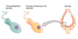Luego de algunas proposiciones sobre las características del ancestro común de todos los animales. Algunos han propuesto la pérdida de características complejas del los Eumetazoa, en particular la pérdida del sistema nervioso y muscular en las esponjas, la falta de coanocitos en Ctenophora, y que el coanodermo sería una apomorfía del grupo Porifera y quizá también de Choanoflagellatea.[6] aunque los análisis moleculares señalan que los coanoflagelados divergen antes de las esponjas lo cual genera confusión y problemas en la propuesta de Choanozoa (Apoikozoa) monofilética,[7] cabe destacar que no se usaron a representantes de ctenóforos por lo que aún pueden caer dentro de Metazoa.[8] Los coanoflagelados podrían ser bien un grupo de metazoos extremadamente simplificados perdiendo hasta la multicelularidad en algunos casos (Acanthoecida), de manera similar a los mixozoos que hoy se sabe que son cnidarios simplificados y se confunden con protistas.[9][10][11] Se podría considerar la hipótesis AME (Apoikozoa-Metazoa-Eumetazoa) donde los tres clados tradicionales que definen Animalia se vuelven sinónimos.
