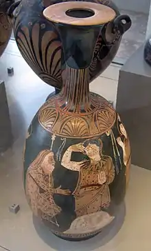 En la cerámica griega la primera representación conocida del mito es un ánfora tirrena de mediados del siglo VI a. C.[23][24] Un siglo más tarde desarrolló su trabajo un pintor que la historiografía ha denominado Pintor de los nióbides[25] a partir de la crátera utilizada para definir su estilo (datable a mediados del siglo V a. C.)[26][27] Lo particular de su composición, con los personajes dispuestos en dos niveles diferentes, ha permitido conjeturar que la composición está inspirada en una gran pintura mural.[28]
