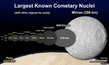 Se cree que la mayoría de los núcleos de los cometas no tienen más de unos 16 kilómetros de diámetro.[48] Los cometas más grandes que han entrado en la órbita de Saturno son 95P/Quirón (≈200 km), C/2002 VQ94 (LINEAL) (≈100 km), Cometa de 1729 (≈100 km), Hale-Bopp (≈60 kilómetros), 29P (≈60 km), 109P/Swift-Tuttle (≈26 km), y 28P/Neujmin (≈21 kilómetros).