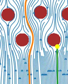 | Las partículas continuarán en línea recta mientras que el fluido evitará el obstáculo. Es decir las partículas impactarán con el obstáculo. | |
