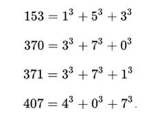 | Base 10 | 0, 1, 2, 3, 4, 5, 6, 7, 8, 9, 153, 370, 371, 407, 1634, 8208, 9474, ... (sucesión A005188 en OEIS) |