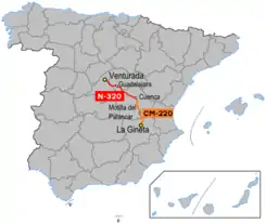 - Antaño la vía era más larga. Contaba con un tramo (La Gineta-Cuenca) correspondiente en la actualidad desde 2007 a la CM-220 y gestionado por la Junta de Comunidades de Castilla-La Mancha.[2] Dicha carretera CM-220 comienza en la A-31 y pasa por las localidades de Tarazona de la Mancha, Quintanar del Rey, Villanueva de la Jara (N-310), El Peral, cruza la A-3, Motilla del Palancar (N-3), Gabaldón y Almodóvar del Pinar. El paisaje es muy llano y seco y solo presenta algunas montañas al pasar cerca de Alarcón. Tras pasar el Puerto de La Tórdiga, la CM-220 llega a la ciudad de Cuenca. Aquí (con el cambio de nomenclatura a nacional), la carretera pasa por el Sur de esta población en forma de circunvalación (el trazado antiguo que lleva al centro de la ciudad se denomina N-320a), cruzándose con la N-420 y la A-40 (antigua N-400).