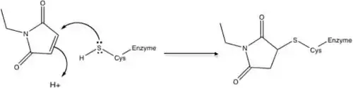 La NEM es un aceptor en la reacción de Michael, es decir, añade nucleófilos como los tioles. El tioéter resultante presenta un enlace C-S muy fuerte y la reacción es virtualmente irreversible. La reacción con los tioles se da en el rango de pH entre 6,5 y 7,5. A un pH más alcalino, la NEM puede reaccionar con aminas o experimentar hidrólisis. En la enzimología, la NEM sirve para probar la funcionalidad de los grupos tiol. Es un inhibidor irreversible de todas las cisteína peptidasas mediante la alquilación del grupo tiol del sitio activo.[3][4]