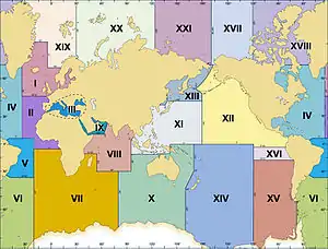 - Mapa de las 21 NAVAREAs y sus estaciones de radio.
