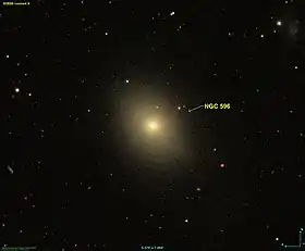 NGC 596 es una galaxia elíptica en la constelación de Cetus . La galaxia se encuentra a 65 millones de años luz de la Tierra, lo que significa, dadas sus dimensiones aparentes, que NGC 596 tiene aproximadamente 60.000 años luz de diámetro. La galaxia muestra una envoltura exterior y es un remanente de fusión. El perfil de brillo de la superficie es liso y sin rasgos distintivos. [1] La galaxia alberga un agujero negro supermasivo, cuya masa se estima en 170 millones (10 8,24) . [2]
