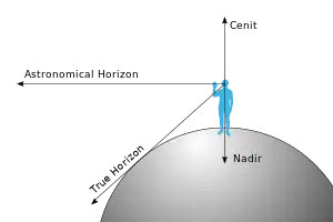 En astronomía, se denomina nadir (del árabe نظير nathir, "opuesto") a la intersección entre la vertical del observador y la esfera celeste. Es decir, si se imagina una recta que pasa por el centro de la Tierra y por nuestra ubicación en su superficie, el nadir se encuentra sobre esa recta, por debajo de nuestros pies.[1] En sentido contrario, se encuentra el cenit.[2] El nadir es un punto "debajo" de una ubicación particular. "Debajo" significa en la misma dirección que la gravedad de ese lugar. El nadir no es un punto real. Se utiliza como referencia para la ubicación de otras cosas.