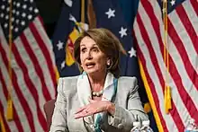 Nancy Patricia Pelosi (de soltera, D'Alessandro; Baltimore; 26 de marzo de 1940) es una política estadounidense que desempeñó cómo la 52.ª presidenta de la Cámara de Representantes de los Estados Unidos desde 2019 a 2023, y previamente de 2007 a 2011. Representa al 11.º distrito congresional de California en la Cámara de Representantes, permaneciendo como congresista desde 1987. La circunscripción, numerada como el 5.° distrito de 1987 a 1993, el 8.° de 1993 a 2013 y el 12.° de 2013 a 2023, comprende la mayor parte de la ciudad de San Francisco. Miembro del Partido Demócrata, Pelosi es la primera mujer en la historia estadounidense elegida presidenta de la Cámara, y la primera en liderar un partido dentro de cualquiera de las cámaras del Congreso de los Estados Unidos.[1] Dirigió a los demócratas de la Cámara durante 20 años, de 2003 a 2023.