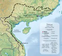 Nanyue comprendía originalmente las comandancias Qin de Nanhai, Guilin, y Xiang. Después del 179 a. C., Zhao Tuo persuadió a Minyue, Yelang, Tongshi y otras zonas para que se sometieran al dominio de Nanyue, pero no estaban estrictamente bajo su control. Después de que la dinastía Han occidental derrotara a Nanyue, su territorio se dividió en las siete comandancias de Nanhai, Cangwu, Yulin, Hepu, Jiaozhi, Jiuzhen y Rinan. Tradicionalmente se creía que la conquista Qin de las regiones meridionales incluía la mitad norte de Vietnam, y que esta zona también estaba bajo el control de Nanyue. Sin embargo, los eruditos han afirmado recientemente que es probable que los Qin nunca conquistaran territorio en lo que hoy es Vietnam, y que la dominación china allí fue lograda primero por los propios Nanyue.[6]