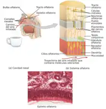![]() Corte transversal del interior de una nariz que muestra las partes involucradas en el olfato ( olfato) | ||