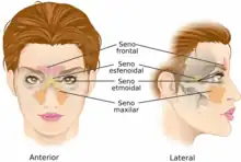 El seno maxilar está inervado por nervios alveolares superiores de los nervios maxilar e infraorbitario.[13][43] El seno frontal está inervado por ramas del nervio supraorbitario . Los senos etmoidales están inervados por ramas etmoidales anterior y posterior del nervio nasociliar. El seno esfenoidal está inervado por los nervios etmoidales posteriores.