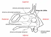 La arteria esfenopalatina y las arterias etmoidales irrigan las paredes externas de la cavidad nasal. Existe un suministro adicional de una rama de la arteria facial: la arteria labial superior. La arteria esfenopalatina es la principal responsable de la irrigación de la mucosa nasal.[4]