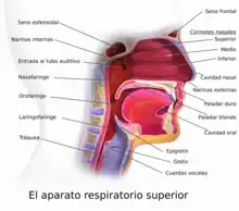La mayor parte de la cavidad nasal y los senos paranasales está revestida con epitelio respiratorio como mucosa nasal. En el techo de cada cavidad hay un área de epitelio olfatorio especializado. Esta región mide aproximadamente 5 cm cuadrados y cubre el cornete superior, la placa cribiforme y el tabique nasal.[22]