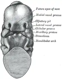 En el desarrollo temprano del embrión, las células de la cresta neural migran para formar el tejido mesenquimal como ectomesénquima de los arcos faríngeos. Al final de la cuarta semana, el primer par de arcos faríngeos forma cinco prominencias o procesos faciales: un proceso frontonasal no apareado, procesos mandibulares apareados y procesos maxilares apareados.[44][45] La nariz está formada en gran parte por la fusión de estas cinco prominencias faciales. La apófisis frontonasal da lugar al puente de la nariz. Las apófisis nasales mediales proporcionan la cresta y la punta de la nariz, y las apófisis nasales laterales forman las alas o lados de la nariz. La apófisis frontonasal es una proliferación de mesénquima situada delante de las vesículas cerebrales[45] y constituye el borde superior del estomodeo.