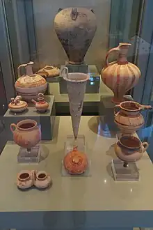 En las tumbas se han encontrado, además de los restos óseos, abundantes objetos de ajuares funerarios, como recipientes de cerámica, armas de bronce, sellos y joyas.[1] Los hallazgos se conservan en el Museo Arqueológico de Nemea.[3]