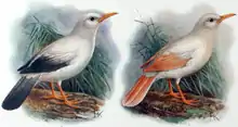 Se encuentra un ave pequeña que no es común, aunque no se encuentra en la isla principal. Se observa en el islote de Mât [isla Gombrani], que está al sur de la isla principal, y creo que se mantiene en ese islote a causa de las aves de presa que hay en la isla principal, además de para alimentarse con más facilidad de los huevos de las aves pescadoras de que se alimenta, ya que no se alimenta de nada más que de huevos y de tortugas muertas de hambre, que sabe bien cómo desgarrar y sacar de sus conchas. Estas aves son un poco mayores que un mirlo [bulbul de Réunion (Hypsipetes borbonicus)], y tiene plumaje blanco, aparte de las alas y la cola negras, el pico amarillo además de las patas, y produce un trino maravilloso. Digo un trino, aunque tiene muchos notas y completamente diferentes. Nosotros criamos algunos con carne cocinada, cortada muy menuda, que ellos comían con preferencia a las semillas.[nota 1][6][3][24]