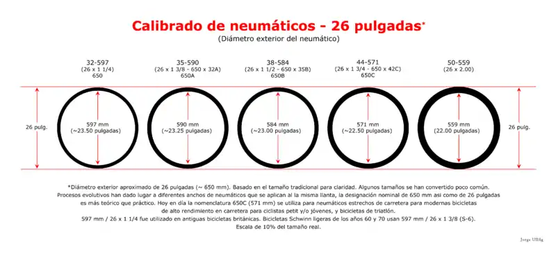 La típica llanta de 26 pulgadas tiene un diámetro de 559 mm (22,0") y un diámetro aproximado exterior del neumático de 26" (~650 mm).