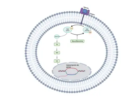 Cuando se ensambla el complejo Ras-Nf1, el Ras activo se une al surco presente en el dominio catalítico de la neurofibrina. Esta unión ocurre a través de las regiones I y II del interruptor Ras y los dedos de arginina presentes en la neurofibrina[20]. La interacción entre Ras y la neurofibrina da como resultado la hidrólisis de GTP a GDP estimulada por GAP[20]. Este proceso se basa en la estabilización de residuos en las regiones interruptor I y interruptor II de Ras, lo que lleva a la confirmación requerida para que Ras adquiera la función enzimática. Esta interacción entre Ras y la neurofibromina también requiere la estabilización del estado de transición para la hidrólisis del GDP, que se logra mediante la inserción de dedos de arginina cargados positivamente en el sitio activo de Ras. Esto neutraliza la carga negativa presente en el GTP durante la transferencia de fosfato[20]. La neurofibrina inactiva Ras al hidrolizar GTP a GDP, lo que regula a la baja la vía Ras, que controla la expresión de genes involucrados en la apoptosis, el ciclo celular, la diferenciación celular o la migración[20].
