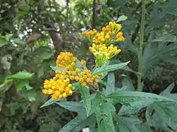 Son hierbas gruesas, perennes. Hojas alternas, márgenes dentados a veces lobados, haz escabrosa, envés finamente piloso y menudamente glandulosas; pecioladas. Capitulescencias de panículas corimbiformes grandes; capítulos radiados o discoides; filarias en 3–4 series, imbricadas, obtusas a subagudas; páleas evidentes, estriadas, planas, muy parecidas a las filarias en color y textura; flósculos del radio 8–10, fértiles (cuando presentes), amarillos, verdosos al secarse, el tubo largo, las lígulas cortas; flósculos del disco 15–21, perfectos y fértiles, verdes cuando secos. Aquenios casi columnares, cafés a negros, ángulos muy indefinidos en la madurez, carpopodio bien desarrollado; vilano de numerosas cerdas capilares de color blanco sucio a café-amarillento.[3]