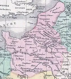 El residuo occidental de la marcha de Neustria, es decir, su parte al oeste del eje París-Tours, fue confiado simultáneamente al mando único del conde. Roberto, calificado con el título de Demarche[12] (demarcus[13]), es decir, de los dos pasos o del paso doble (no confundir con demarchus del griego). Δήμαρχος, jefe de dem'[14]). En realidad, la región, aparte del valle del Loira y los alrededores de le Mans, escapó a la administración de Francesa[15]. En 932, el conde de los normandos William Espada Larga anexionó el Cotentin y el Avranchin a Normandía. bretons, junto con el Monte Saint-Michel.