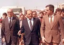Nicolás Linares con el Presidente del Gobierno de España, Leopoldo Calvo-Sotelo, y Luis Merino Bayona, candidato a la Presidencia de la Junta de Andalucía.