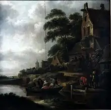 Paisaje con río y posada, óleo sobre tabla, 46 x 46,5 cm, Madrid, Museo Lázaro Galdiano.