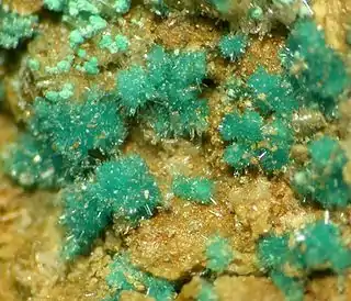 Suele encontrarse asociado a otros minerales como: yeso, malaquita, calcantita, brochantita, hemimorfita, hidrocincita, auricalcita, monteponita, otavita, esfalerita, greenockita, hawleyita, pirita o galena.