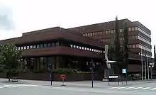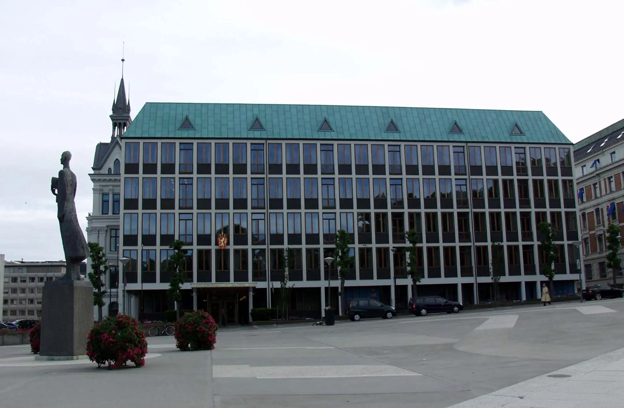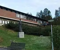 Ayuntamiento de Steinkjer, con escultura de Aas en el exterior.