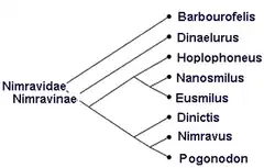 Los nimrávidos (Nimravidae), a veces conocidos como falsos dientes de sable, son una familia extinta de mamíferos carnívoros. Algunos de ellos poseían una apariencia física similar a los dientes de sable del género Smilodon, pero no estaban estrechamente relacionados con ellos, sino que evolucionaron de manera similar debido a la evolución convergente. Eran endémicos en América del Norte, Europa y Asia; existieron durante el Eoceno y Mioceno (desde hace 42—7,2 millones de años), existiendo durante aproximadamente 34,8 millones de años.[1]