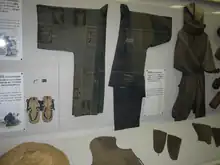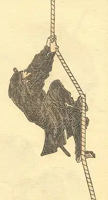 La referencia más antigua con que se cuenta al día de hoy de ninja vestidos todos de negro se encuentra en la ilustración de un libro del año 1801 en la que se observa a un ninja escalando un castillo en lo que es considerado el día de hoy como la vestimenta típica.[48] Un aspecto que hay que resaltar es que probablemente de esa representación proviene la imagen actual de la vestimenta ninja, la cual muy seguramente derivó de una convención artística recurrente en Japón, sobre todo en el bunraku, en la cual vestir a una marioneta de negro daba la idea al espectador de que no la podía ver.[48] Los mismos titiriteros utilizan vestimentas como las descritas con la misma finalidad.[49] De cualquier forma, no es de extrañarse que durante incursiones nocturnas, la vestimenta ideal fuera de colores oscuros,[48] preferiblemente azul marino.[50] De igual modo, durante las nevadas en los inviernos de Japón el color preferible sería todo de blanco, debido a la naturaleza ninja de camuflarse con el entorno.[51]