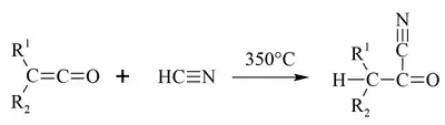 | Cianuro de acilo | Cetena | Reactivo: Se hace reaccionar una cetena con cianuro de hidrógeno a 350 °C