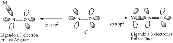 Según la regla de los 18 electrones, el NO puede actuar como ligando a 1 o 3 electrones según el contaje electrónico covalente. Como ligando a 1 electrón el NO se enlaza al átomo metálico de mostrando una geometría angular mientras que el NO a 3 electrones muestra una geometría lineal.