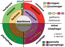 - Los consumidores obtienen frecuentemente su alimento de más de un nivel trófico. P. ej., cuando un sapo común europeo busca alimento, tiende a atacar a cualquier cosa que se mueva y parezca tener un tamaño adecuado; consume pues animales pequeños de ecologías muy variadas, entre los que habrá insectos herbívoros, como los saltamontes, insectos carnívoros, como las mantis, caracoles terrestres, que son herbívoros, o lombrices de tierra, que son detritívoras. Cuando ocurre esto deja de ser fácil precisar el nivel trófico, que se definirá en función del alimento predominante; y cuando este criterio no baste, del nivel más alto de los de sus presas. Una complicación añadida es que las poblaciones de animales omnívoros, o de los simplemente polífagos, se especializan a menudo en distintos alimentos en distintos territorios, o en distintas épocas del año. Por ejemplo, los mismos osos pardos de Alaska que capturan salmones durante su migración, se alimentan el resto de su período de actividad, principalmente de alimentos vegetales.
