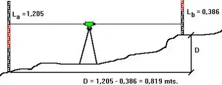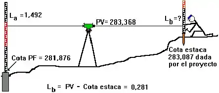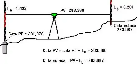 Esto no es necesario, y en la práctica suele tornarse engorroso; una vez tomada la lectura se suma este valor a la cota del PF y hemos obtenido la cota del PV. Ya obtenida esta cota se colocará la mira sobre la estaca a la que se quiere dar cota y se tomará una nueva lectura. A partir de ella se podrá notar que esta lectura es la diferencia entre la cota del PV y la cota de la estaca, de manera que restamos la lectura obtenida a la cota del PV y el resultado es la de la estaca.