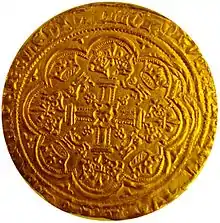 La leyenda anversa de Eduardo III Segunda acuñación:EDWARD GRA REX ANGL Z FRANC DNS HYB ("Eduardo por la gracia de Dios Rey de Inglaterra y Francia Señor de Irlanda"). Diseño: El rey, sosteniendo una espada y un escudo en un barco. Leyenda inversa: IHC AUTEM TRANSIENS POR MEDIO ILLORUM IBAT("Pero Jesús, pasando por en medio de ellos, se fue"). Diseño: 'L' en el centro de una cruz. La imagen del barco y el texto bíblico (del Evangelio de Lucas 4:30) conmemoran la victoria de Eduardo en la Batalla de Sluys en 1340.[1]