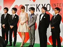 Okamoto junto al elenco de Sakasama no Patema, en el Festival Internacional de Cine de Tokio de 2013.