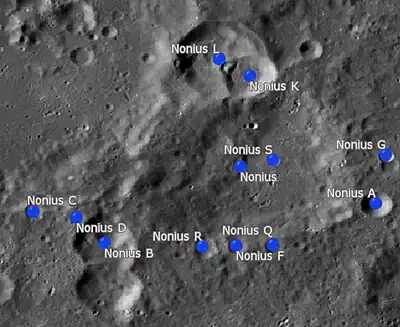 Por convención estos elementos son identificados en los mapas lunares poniendo la letra en el lado del punto medio del cráter que está más cercano a Nonius.