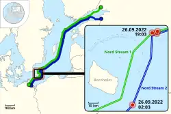 En el momento del atentado, los gasoductos estaban llenos de gas pero su flujo estaba detenido. El Nord Stream 1 estaba parado por falta de uno de sus turbocompresores mientras que el Nord Stream 2 no había llegado a ser puesto en servicio debido a la oposición estadounidense. El 26 de septiembre a las 02:03 hora local (CEST), se detectó una explosión con origen en Nord Stream 2, se informó de una caída de presión en la tubería y comenzó a escaparse gas natural a la superficie al sureste de la isla danesa de Bornholm. Diecisiete horas después, ocurrió lo mismo con Nord Stream 1, lo que resultó en tres fugas separadas al noreste de Bornholm.[3][4] Las tres tuberías afectadas quedaron inoperables. Las fugas ocurrieron un día después de que Polonia y Noruega abrieran el Baltic Pipe alternativo que atraviesa Dinamarca, trayendo gas del Mar del Norte en lugar de Rusia como lo hacen los gasoductos Nord Stream.[5] Las fugas están ubicadas en aguas internacionales (que no forman parte del mar territorial de ninguna nación), y dentro de las zonas económicas de Dinamarca y Suecia.[6]